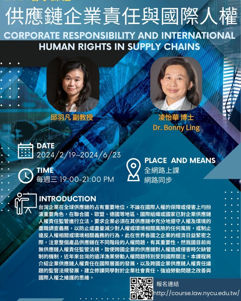 台灣在全球供應鏈具有舉足輕重的角色,本應在國際人權的保護中有亮眼的表現,但我國目前尚無針對接軌國際供應鏈人權責任監管訂定相關法規,致使大部分跨國企業未主動對其供應鏈人權問題研擬完整的監管機制及進行應盡的監管義務,衍生當下台灣企業仍有諸多人權侵犯的個案產生,尤其以遠洋漁業的勞工人權問題備受國際關注,並受相關國際組織的制裁。 本課程含括國際上企業與人權責任的發展、主要國家對供應鏈人權責任的監管法規發展、辨識強迫勞動指標、企業人權盡職調查規範與案例及我國外籍移工勞動人權問題等,養成修課同學對於企業社會責任全面的認識、強迫勞動指標識別與問題改善、國際勞動人權關懷與維護的人本思維,並給予我國企業供應鏈應對國際法規提早建立人權盡職調查機制以減緩衝擊的專業人才培育。