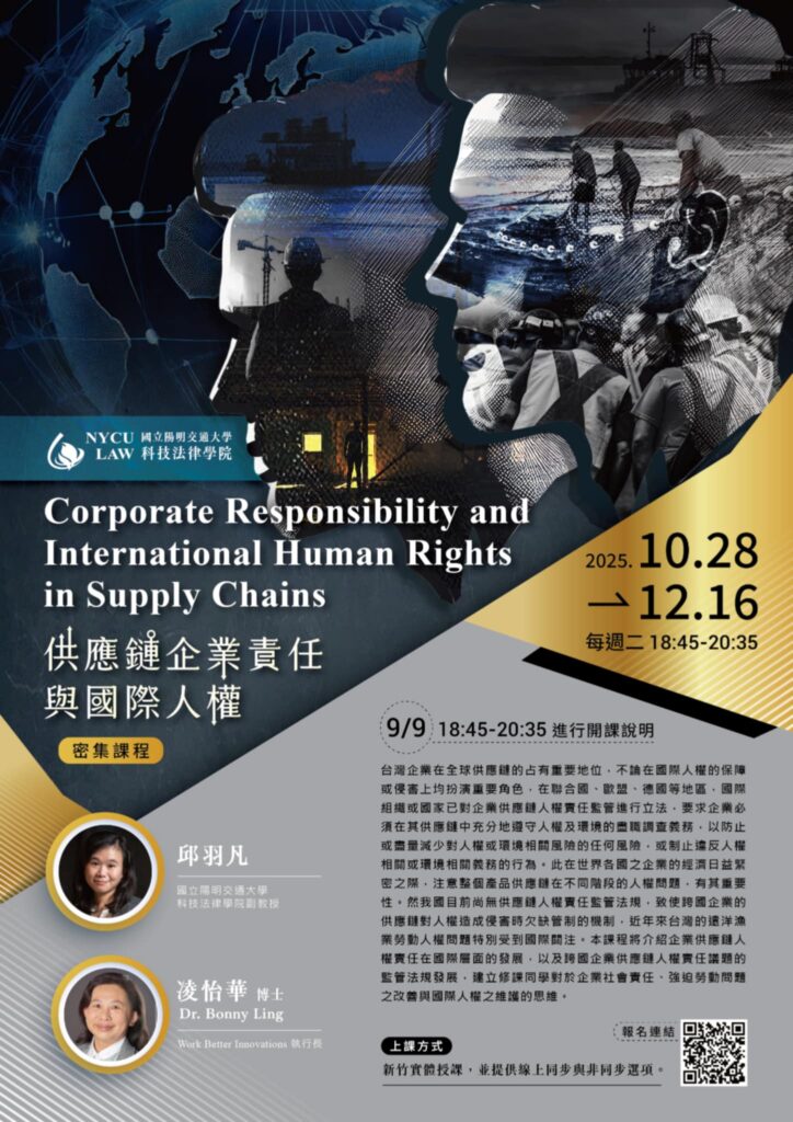 有鑑於此,羽凡老師與Bonny老師共同開設「供應鏈企業責任與國際人權」課程,講述企業供應鏈人權責任在國際上的發展趨勢及相關監管法規的訂立與演進,以全球產業供應鏈密切合作的背景出發,深入淺出地探討供應鏈的國際人權議題及相關的企業責任。