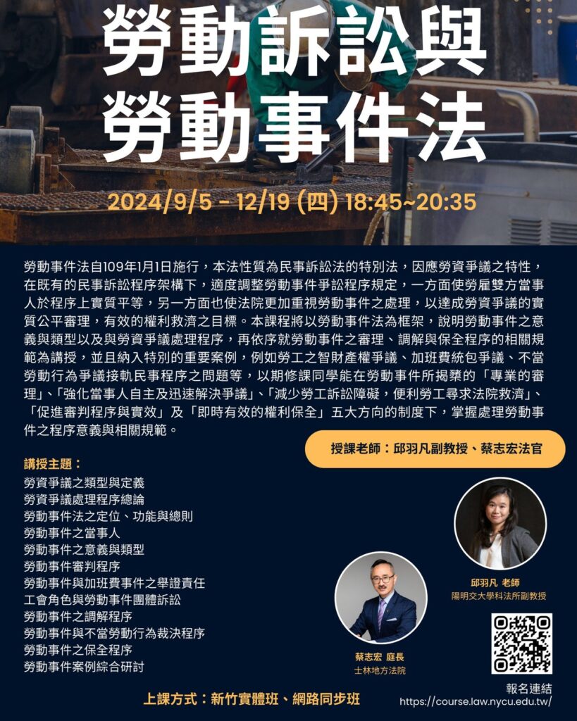 本課程由科法所邱羽凡副教授開設與士林地方法院蔡志宏庭長(現為德勤商務法律事務所合夥律師)共同開設,以勞動事件法為框架,說明勞動事件之意義與類型以及勞資爭議處理程序,再依序講解勞動事件之審理、調解與保全程序的相關規範,並且納入特別的實務重要案例,例如:勞工之智慧財產權爭議、加班費爭議、不當勞動行為爭議接軌民事程序之問題等。透過理論與實務相互交錯之課程設計,期待學生能在勞動事件法所揭櫫的「專業的審理」、「強化當事人自主及迅速解決爭議」、「減少勞工訴訟障礙,便利勞工尋求法院救濟」、「促進審判程序與實效」及「即時有效的權利保全」五大方向的制度下,掌握處理勞動事件之程序意義與相關規定。