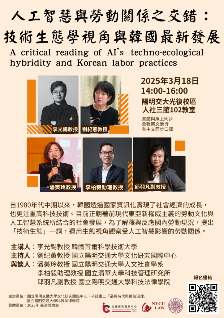 活動要點:李光錫教授以「技術生態」為核心概念,分析韓國在AI發展下的勞動處境。他指出,韓國自1980年代推動國家資訊化後,形成科技樂觀主義社會氛圍,政府與企業高度依賴AI帶動經濟成長,卻忽視AI對勞動與社會的負面影響。透過人類心智、生態環境與社會關係三面向的技術毒性分析,他揭示平台資本主義如何藉演算法控制延伸勞動時間、壓低勞動條件並製造心理壓力,同時AI能源需求亦造成環境剝削與碳排問題。此外,新型數位工作如內容審查外包勞動,也導致看不見的身心損害。與談中,潘美玲教授指出科技樂觀主義背後隱含權力結構,AI治理需重新檢討法律與工會角色;李柏毅助理教授則補充台韓在平台勞動上的差異,強調AI帶來的資本偏見與不平等。邱羽凡副教授總結表示,韓國經驗對台灣具有借鏡意義,AI治理應結合勞動權益與公正轉型思維,避免以勞工與生態為代價換取科技進步。