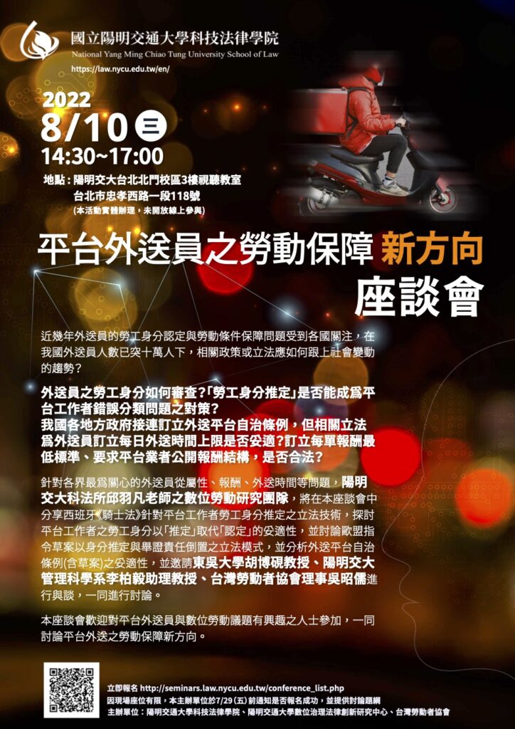 - 平台外送員之勞動保障新方向座談會(2022.08.10 )