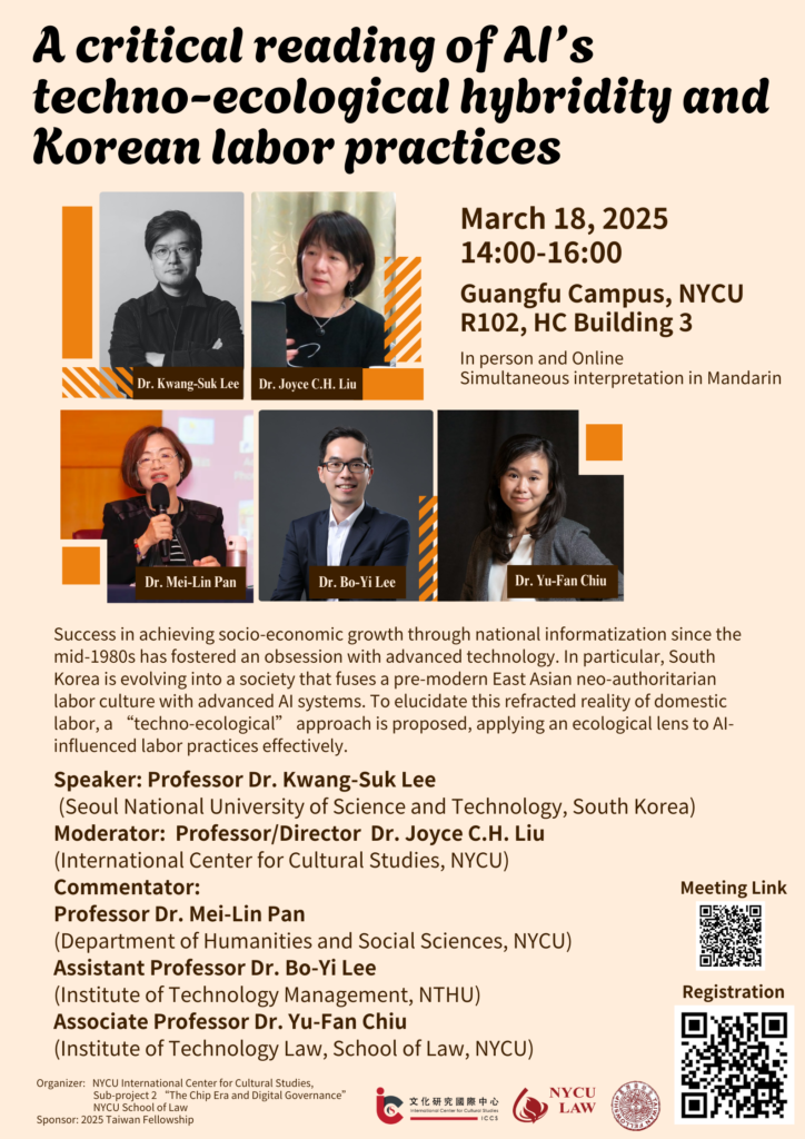 活動要點:李光錫教授以「技術生態」為核心概念,分析韓國在AI發展下的勞動處境。他指出,韓國自1980年代推動國家資訊化後,形成科技樂觀主義社會氛圍,政府與企業高度依賴AI帶動經濟成長,卻忽視AI對勞動與社會的負面影響。透過人類心智、生態環境與社會關係三面向的技術毒性分析,他揭示平台資本主義如何藉演算法控制延伸勞動時間、壓低勞動條件並製造心理壓力,同時AI能源需求亦造成環境剝削與碳排問題。此外,新型數位工作如內容審查外包勞動,也導致看不見的身心損害。與談中,潘美玲教授指出科技樂觀主義背後隱含權力結構,AI治理需重新檢討法律與工會角色;李柏毅助理教授則補充台韓在平台勞動上的差異,強調AI帶來的資本偏見與不平等。邱羽凡副教授總結表示,韓國經驗對台灣具有借鏡意義,AI治理應結合勞動權益與公正轉型思維,避免以勞工與生態為代價換取科技進步。