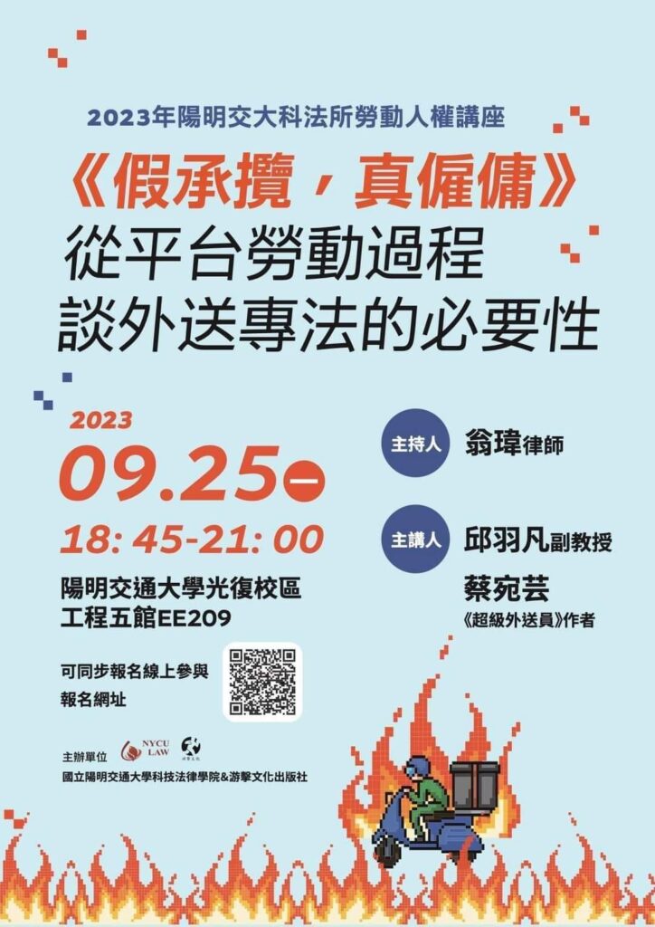 活動要點:本次活動以「假承攬,真僱傭──從平台勞動過程談外送專法的必要性」為題,聚焦平台勞動與外送員勞動權益保障議題。活動由翁瑋律師主持,邀請《超級外送員:使命必達的省時戰》作者蔡宛芸與科技法律研究所邱羽凡副教授進行主講,深入剖析台灣外送平台勞動現況與法律規範問題,並探討制定外送專法的必要性。
