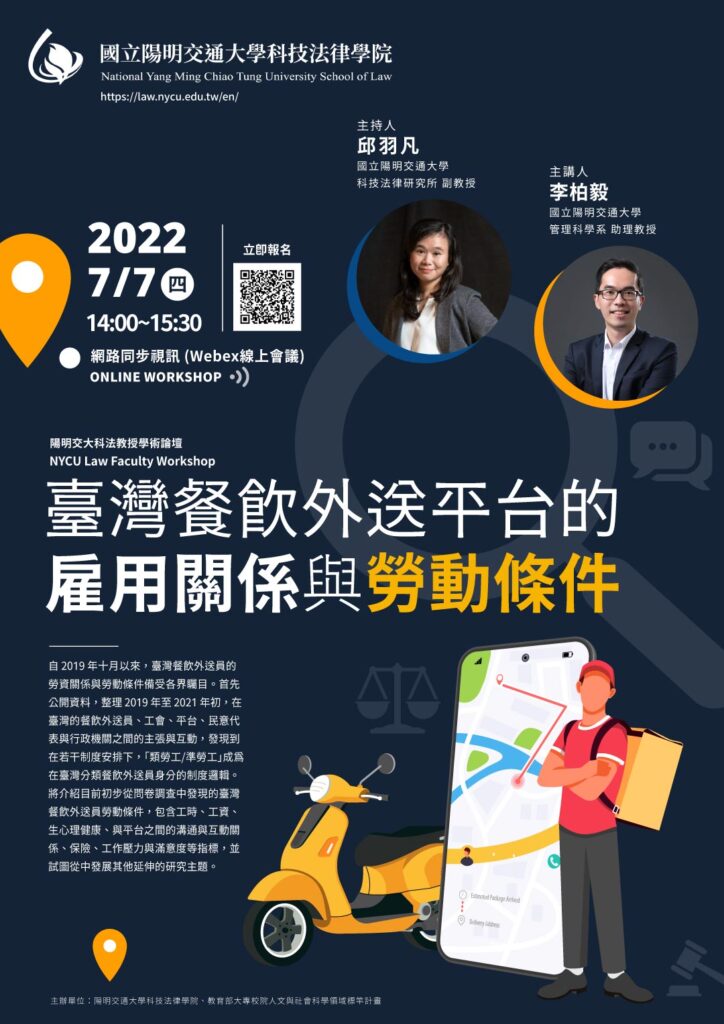 活動要點:2022年10月27日,國立陽明交通大學科技法律研究所與管理科學系、台灣勞動者協會共同主辦「餐飲外送員工作的性別觀點」座談會,聚焦外送產業中的性別不平等與勞動困境。活動由邱羽凡副教授主持,李柏毅助理教授引言,透過其研究發現指出男性外送員平均投入時間較長、收入較高,但女性外送員更常面臨性騷擾等風險,顯示外送勞動現場潛藏性別差異與結構性歧視問題。