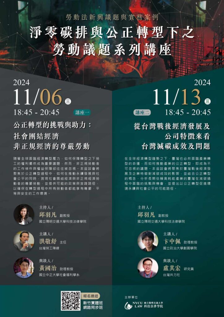 • 淨零碳排與公正轉型下之勞動議題系列講座(講座一):公正轉型的挑戰與助力:社會團結經濟與非正規經濟的尊嚴勞動(2024.11.06)
